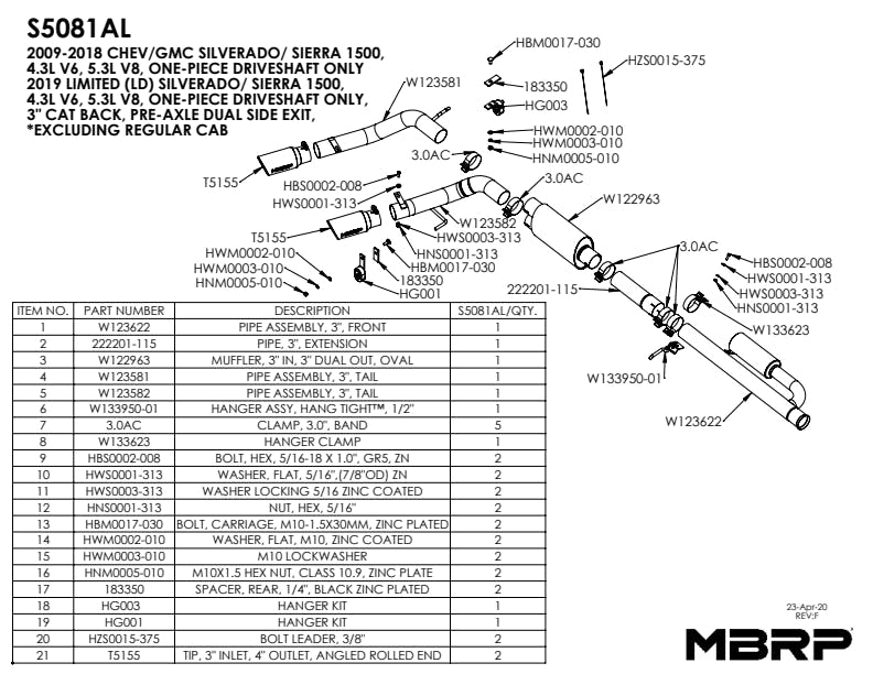 4in. Outside Diameter Tip Included. Excluding Regular Cab. Also fits 2019 Chevy/GMC,1500 Silverado/ Sierra 4.3L V6, 5.3 Limited (LD)